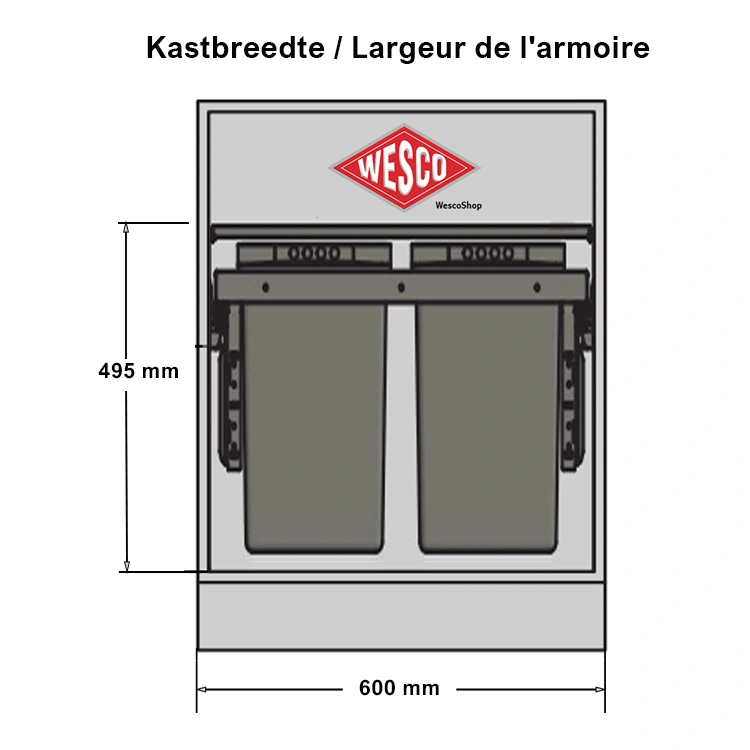 Het WESCO® Pullboy Soft Comfort® 495 K/600-2 is een hoogwaardig afvalscheidingssysteem voor keukens met 600 mm brede onderkasten. Met zijn royale inhoud van 58 liter, verdeeld over twee grote bakken van elk 29 liter, is dit systeem ideaal voor grotere huishoudens en intensief gebruik.