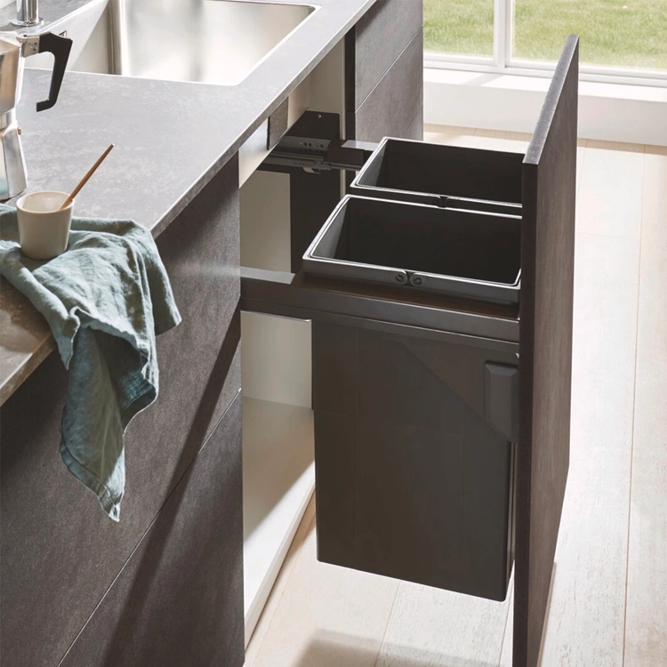 Het vaste deksel blijft in de kast, waardoor de bakken goed afgesloten zijn zodra de lade wordt ingeschoven. Dankzij de softclose-techniek en demping sluit het systeem bijna automatisch en volledig geruisloos. De stevige bakken zijn uitneembaar en gemaakt van duurzaam kunststof in antracietkleur.